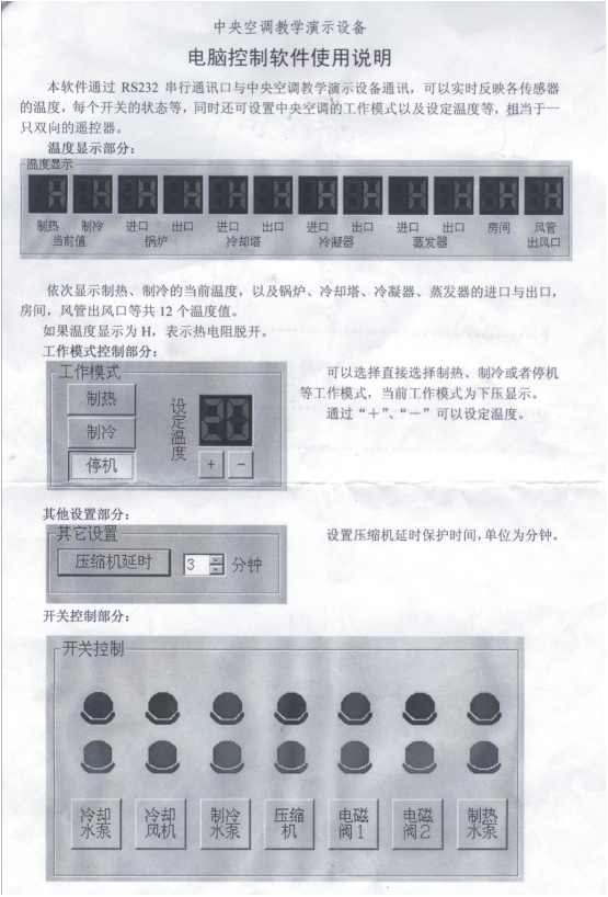 為了更好地滿足各大院校的教學(xué)需要,在原來(lái)開(kāi)發(fā)的中央空調(diào)實(shí)驗(yàn)設(shè)備的基礎(chǔ)上,配備了RS-232串行通訊接口,可直接與電腦連接,由電腦控制軟件控制整個(gè)實(shí)驗(yàn)臺(tái)的運(yùn)行,包括:總控臺(tái)啟動(dòng)、制冷、制熱、冷卻水泵、冷卻風(fēng)機(jī)、制冷水泵、壓縮機(jī)、電磁閥、制熱水泵做演示,制冷、制熱的溫度設(shè)定等。