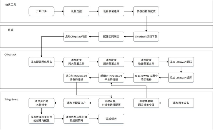模擬智慧牧場系統(tǒng)還引入使用開源軟件平臺ChirpStack與ThingsBoard,結(jié)合LPWAN技術(shù),實(shí)現(xiàn)遠(yuǎn)程低功耗數(shù)據(jù)采集、上報和展示。在ChirpStack平臺上,用戶可對網(wǎng)關(guān)、GPS、溫濕度傳感器等設(shè)備進(jìn)行配置,以上送仿真實(shí)驗(yàn)中的虛擬數(shù)據(jù)。在ThingsBoard平臺上,設(shè)置牧場地圖、告警信息、溫濕度等各儀表盤組件;獲取仿真設(shè)備上送的數(shù)據(jù),并將數(shù)據(jù)以圖表形式作可視化呈現(xiàn);以及基于流式編程添加相應(yīng)的規(guī)則策略,最終完成模擬智慧牧場實(shí)訓(xùn)場景的部署搭建。