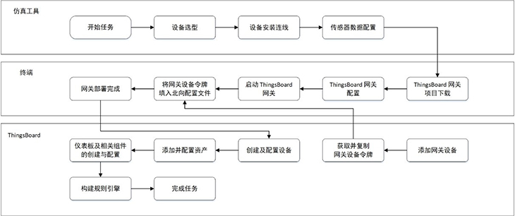 智慧溫室案例,引入了ThingsBoard IoT Gateway開源解決方案,在AIoT平臺的仿真工具中部署ThingsBoard gateway網(wǎng)關(guān),以連接ThingsBoard云平臺,便于上送溫濕度傳感器數(shù)據(jù),搭建恒溫機(jī)執(zhí)行器模塊;ThingsBoard平臺,用戶可在儀表盤內(nèi)添加設(shè)置智慧溫室場景、溫濕度顯示設(shè)備等組件,獲取仿真實(shí)驗(yàn)中上送的虛擬數(shù)據(jù),以動態(tài)曲線的形式作可視化呈現(xiàn);用戶還可根據(jù)案例要求,在ThingsBoard平臺的規(guī)則鏈庫中,自主編輯設(shè)定規(guī)則引擎,實(shí)現(xiàn)智慧溫室的恒溫控制與異常告警。