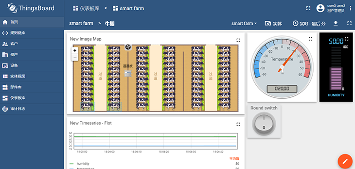 圖:智慧牧場課程案例,在牛棚內(nèi)安裝溫濕度傳感器和排風(fēng)扇,在ThingsBoard云平臺上制定規(guī)則策略,當(dāng)棚內(nèi)溫度過高時自動開啟排風(fēng)扇對牛棚進(jìn)行降溫,以保障奶牛養(yǎng)殖環(huán)境處在適宜的溫度下。